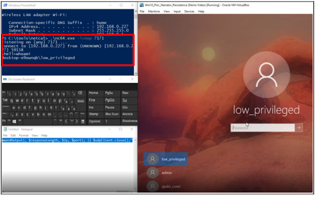 Even if there is no security boundary between windows logon screen and the default user desktop (indeed both part of the same window station WinSta0) the possibility of the interaction between the Narrator instance running in the environment of the locked out users and the Windows logon screen opens the chance to trigger the malicious command defined in the registry as soon as the 'Provide Narrator feedback' combination keys are pressed in the latter context.