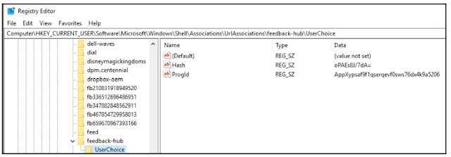 Computer\HKEY_CURRENT_USER\Software\Microsoft\Windows\Shell\Associations\UrlAssociations\feedback-hub\UserChoice