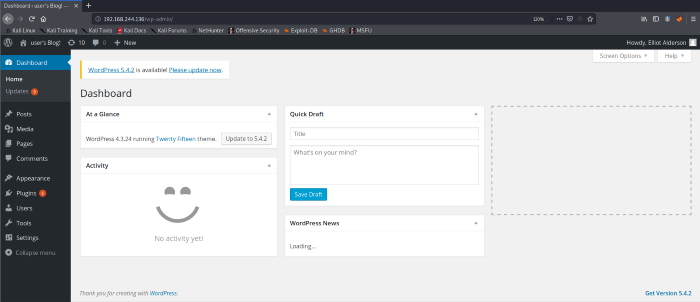 As seen above we got our credentials for the word press login page. Now we can use these credentials to log in. We are now logged in as an admin user for the WordPress Cpanel.